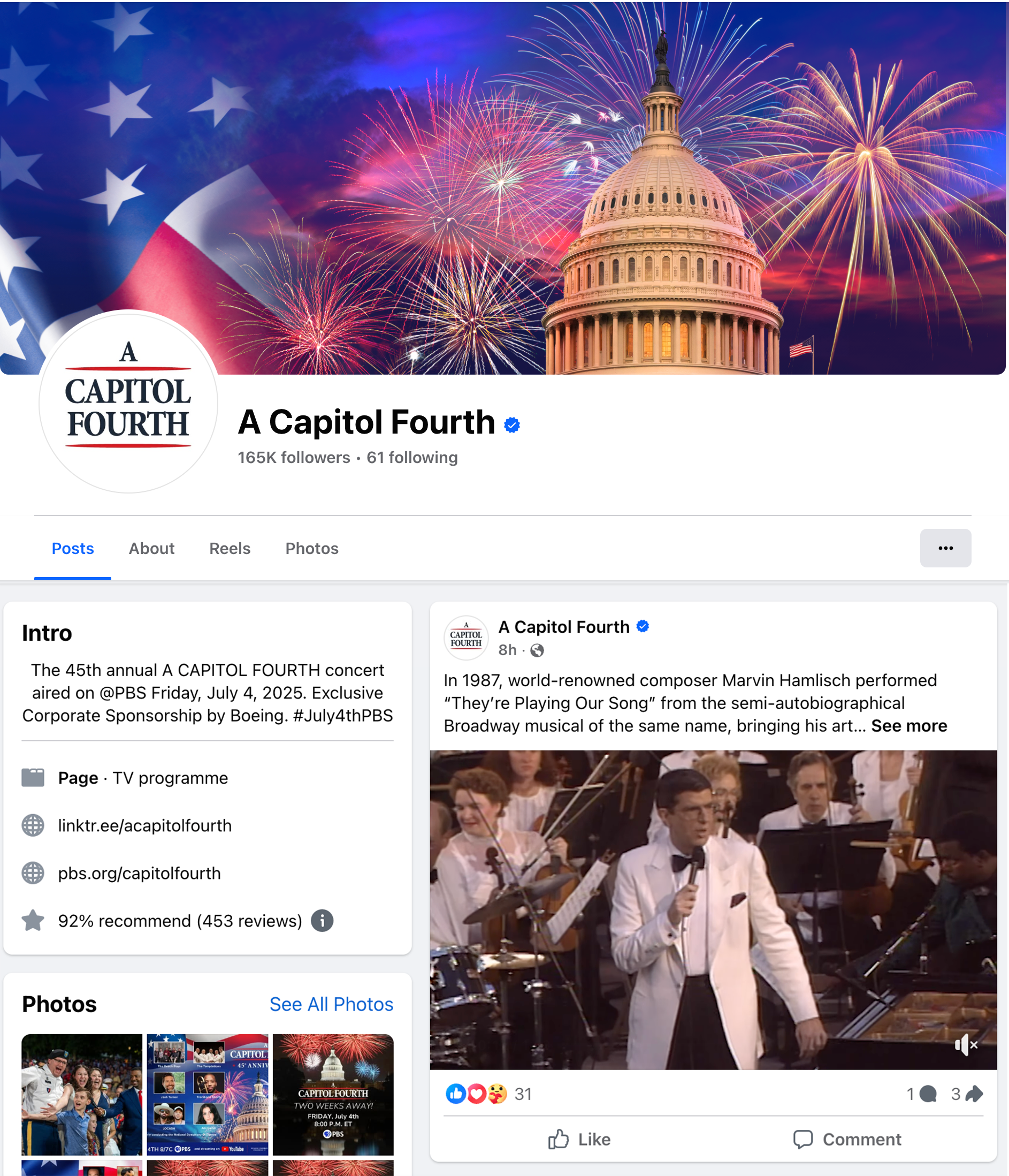 Live Event Social Coverage across Instagram, Facebook, and Youtube during the Capital Concerts PBS events — A Capital Fourth and the National Memorial Day Concert. Community Management and Graphic Design for, during, and after the events.
